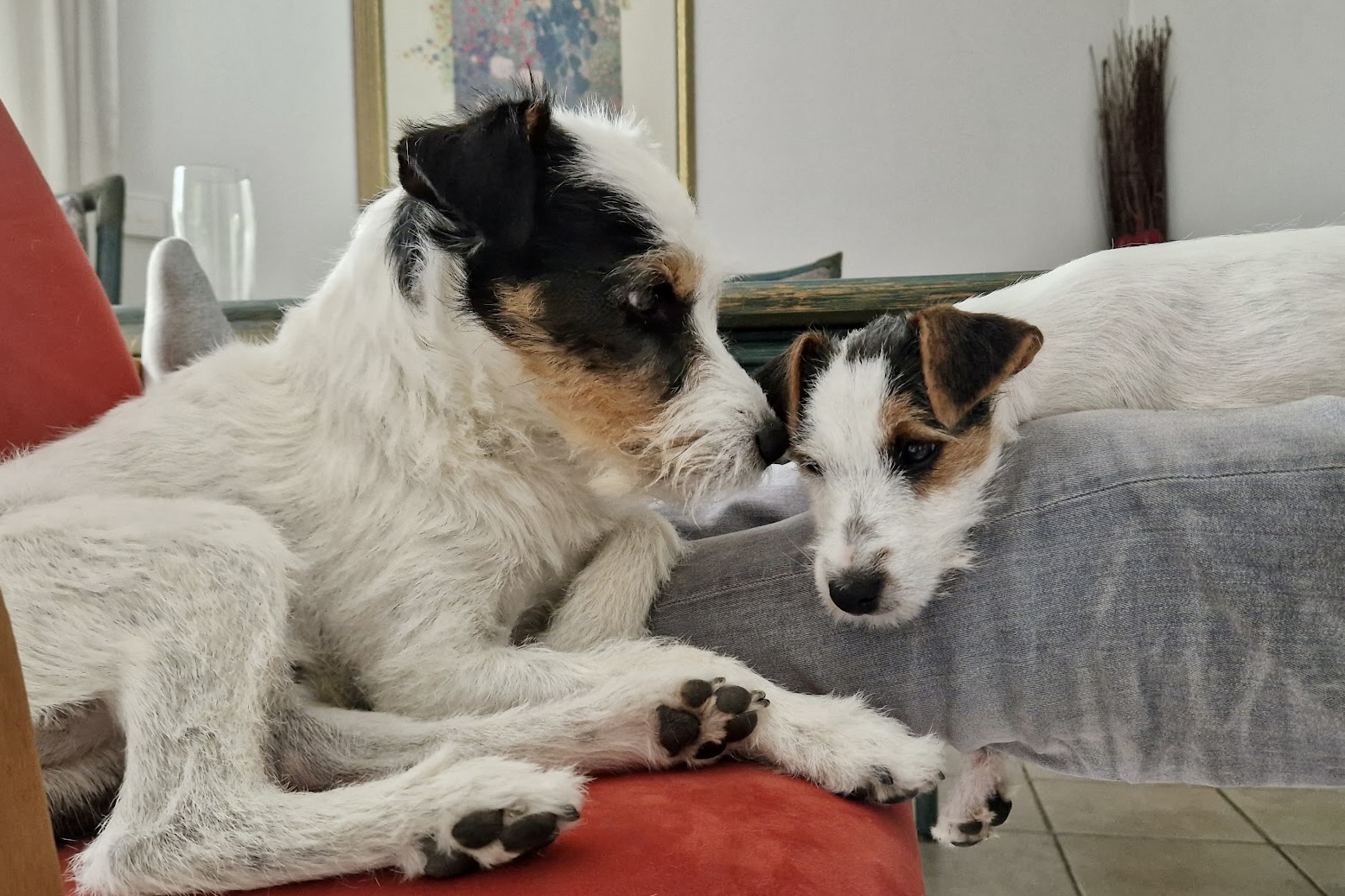 Auch nach so vielen Jahren mit einem Hunde Rudel, ist es immer wieder schön zu beobachten, wie unsere 4-beinigen Freunde ihre gegenseitige Sympathie zum Ausdruck bringen. Vater und Tochter geniessen die körperliche Nähe, die Fellpflege und das Kontaktliegen…..schliesslich geht nichts über eine ordentliche morgendliche Wäsche mit blitzeblank geputzten Ohren 😉